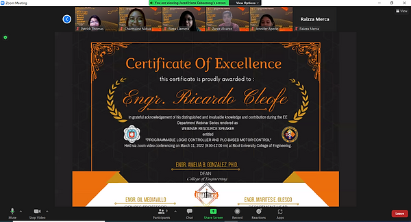 Daniel Ezra Octeza, as the group leader, was assigned with the task of searching for the webinar speaker as well as coordinating with the said speaker. In line with this, he prepared the official Letter of Invitation to the Speaker whom they have chosen. The Speaker is Engr. Ricardo C. Cleofe, who is currently Teacher III (Mechatronics Servicing NC II and EIM NC II Teacher) of SHS-TVL at Tabaco National High School. He is also currently a Part-time Instructor of Programming and Managing PLC at San Francisco Institute if Science and Technology (SFIST). He has experiences on the Electrical Engineering Field and has also been the Speaker of past webinars such as “Mechatronics and Robotics Webinar” which was also held at Bicol University.